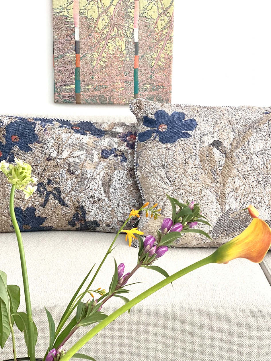 Op basis van het plaid ‘Prosperity’ zijn er een serie kussens vervaardigd. Er zijn twee grote kussens van 50 x 55 cm. De kleuren zijn indigoblauw en helder rood met een ondergrond van neutrale beiges en grijs. Allemaal met een geweven bies. Inclusief rits en vulling.