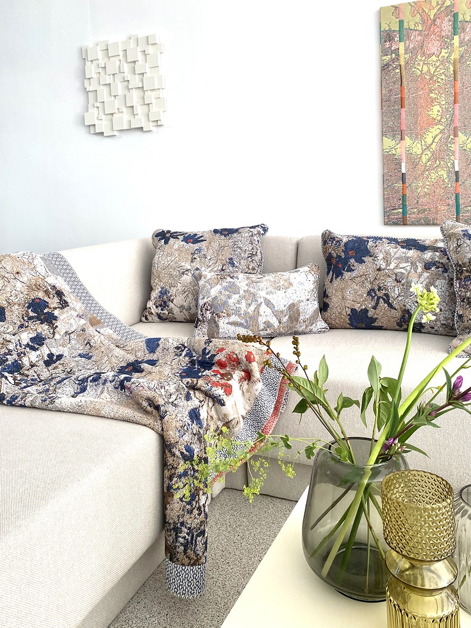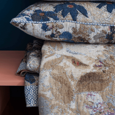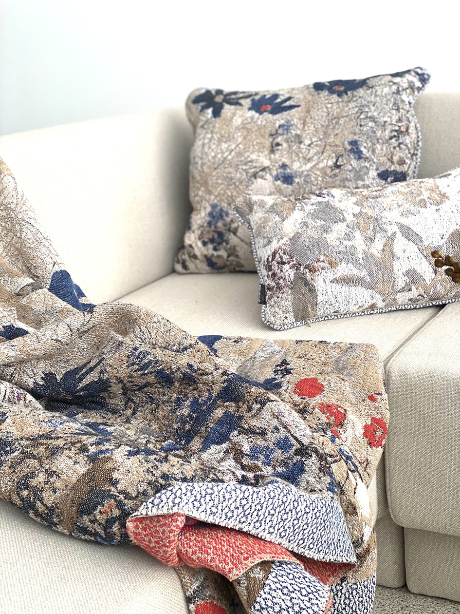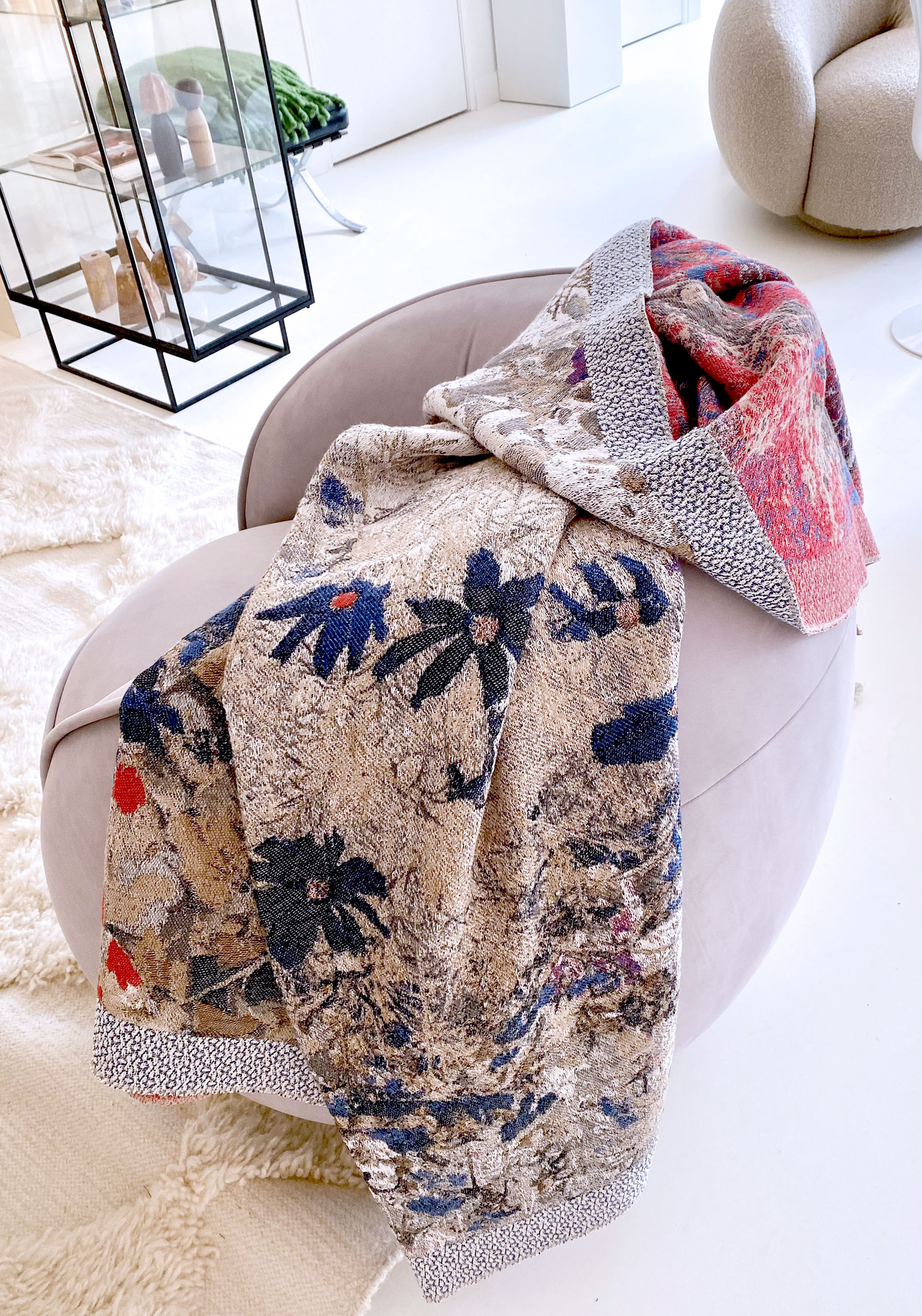 Laat je omhullen door de warmte en schoonheid van de natuur met luxe plaid Prosperity. De plaid is vervaardigd in Portugal met de hoogste kwaliteit en vakmanschap. Op de plaid vind je een verfijnd patroon van een bloemenweide met subtiele blauw-rode bloemen. Een prachtig ontwerp waarmee je iedere sofa, fauteuil, bank of bed verrijkt. Ook mooi te combineren met het vierkante kussen Prosperity of rechthoekige kussen Prosperity.